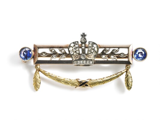 A Russian diamond and sapphire brooch, adorned with the Russian Warrant