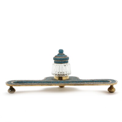 A Russian parcel-gilt and white and turqouise enamelled writing set, fluted glass inkstand