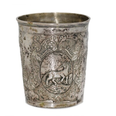 A Russian Rococo silver beaker, punched with animal and angel motifs