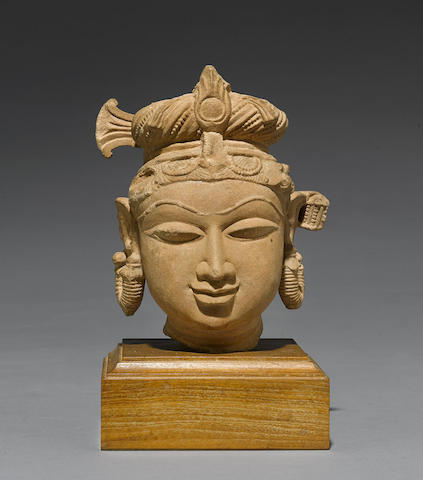 Finely carved with heavy-lidded eyes, full lips and youthful cheeks, flanked by two large horseshoe-shaped earrings, the headdress with beaded jewelry