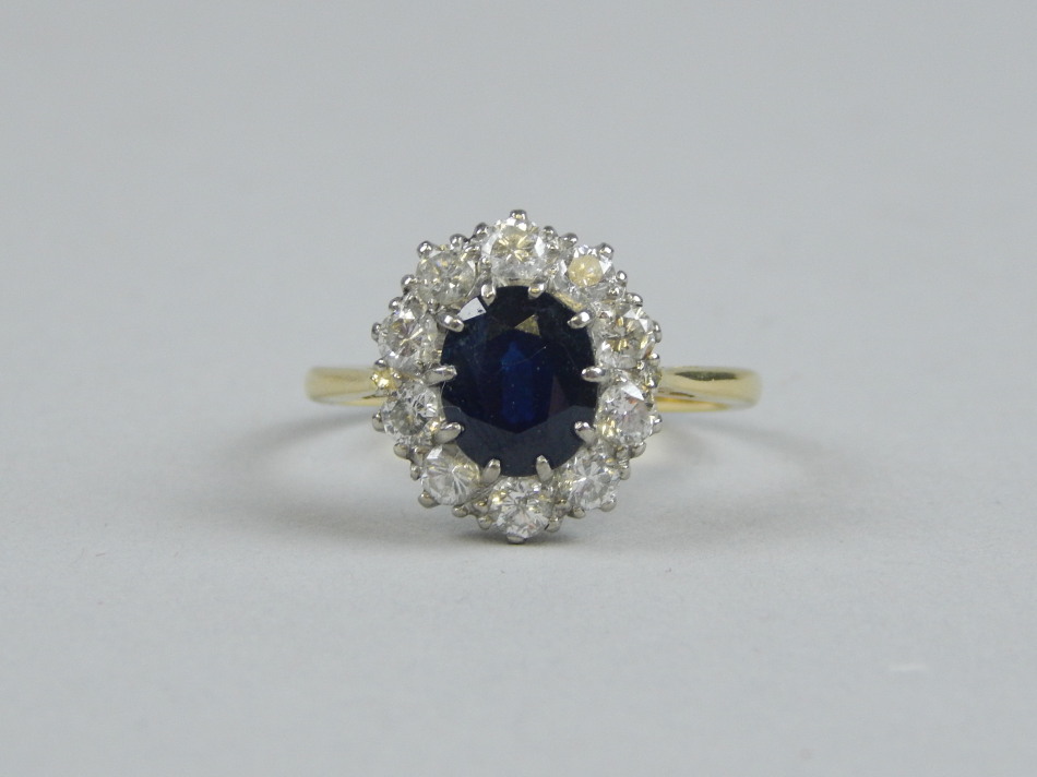 central sapphire 8.2mm x 6.8mm x 3.8mm, surrounded by ten diamonds, each stone approx 0.06cts, total estimated carat weight 0.6ct, yellow metal shank, marked 18ct, 4.4g all in