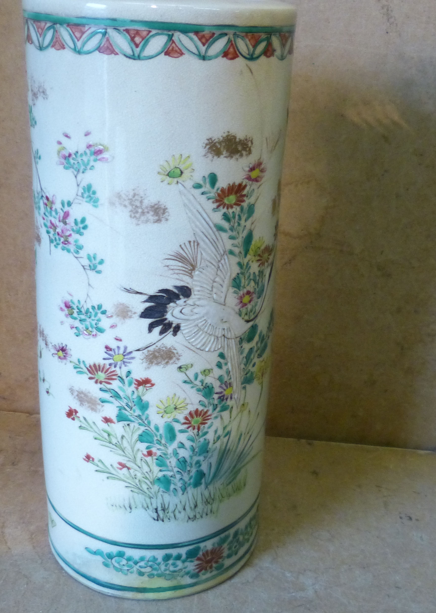 A Satsuma Cylindrical Vase on cream ground with multicoloured bird, floral, leaf and gilt decoration