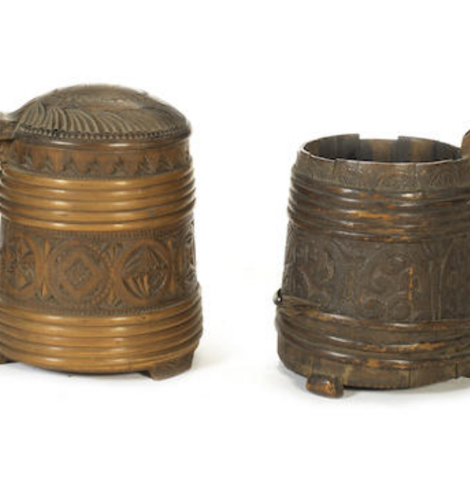 Of staved construction and decorated with stylised scrolling foliage, bound with canework, on three feet, together with another lidded tankard with chip carved decoration