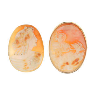 To include an oval brooch, the shell carving depicting a man riding a chariot pulled by two birds, another unmounted oval-shape cameo, depicting a bacchante. Marks indicating gold. Lengths 3 to 5.2cms. Weight 21.4gms.
