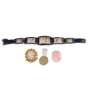 To include a tortoiseshell and shell cameo panel bracelet, with further conch shell, lava cameo and shell cameo items with one further item. Length of bracelet 18.3cms.