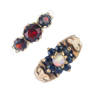A selection of four 9ct gold gem-set rings. To include an oval-shape amethyst single-stone ring, a circular-shape garnet three-stone ring, together with two further rings. Hallmarks for 9ct gold. Weight 14gms.