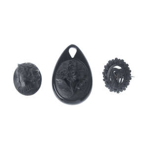A selection of late 19th century jet, vulcanite, bog oak and ivory jewellery, panels and pieces.