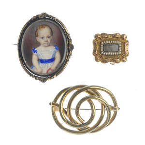 To include a miniature portrait brooch depicting a young girl, a scrolling brooch, a split pearl mourning brooch, together with eight further items. Some items AF.