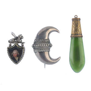To include an Edwardian silver shield-shape photograph pendant with lion surmount, two butterfly wing brooches and a nephrite jade pendant. (13) Hallmarks for Birmingham, 1909. Lengths 5.8 to 1.4cms. Total weight 84gms.