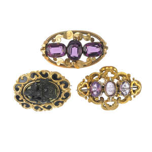 To include a cross pendant with diamond shape engravings front and back, together with an oval brooch, the three purple pastes collet-set through the centre, to the scrolling accents and plain surround. Lengths 2.1 to 6cms. Weight 131.3gms.