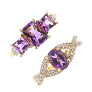 A selection of three 9ct gold gem-set rings. To include a rectangular-shape amethyst three-stone ring with single-cut diamond quatrefoil sides, an oval-shape amethyst ring with single-cut diamond crossover sides, together with a paste, amethyst and d
