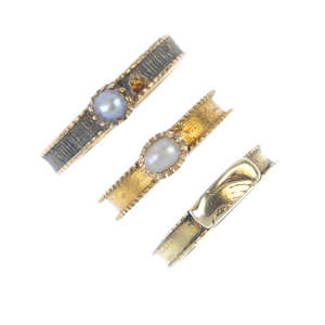 To include two split pearl and woven hair band rings, together with a clasped hand woven hair band ring. Some hair sections missing. Weight 3.4gms.