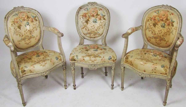 in white, the oval backs with tied bows, overstuffed seats, on fluted turned legs, includes two elbow chairs. (4)