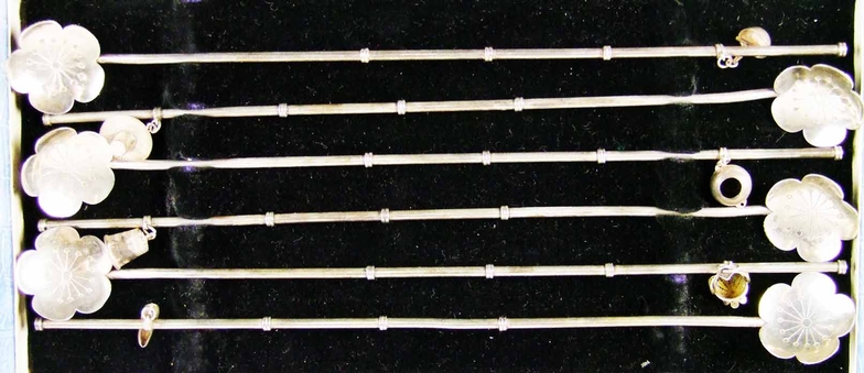 A set of six Chinese long stem spoons, each with flowerhead bowl and suspending a 'charm', cased