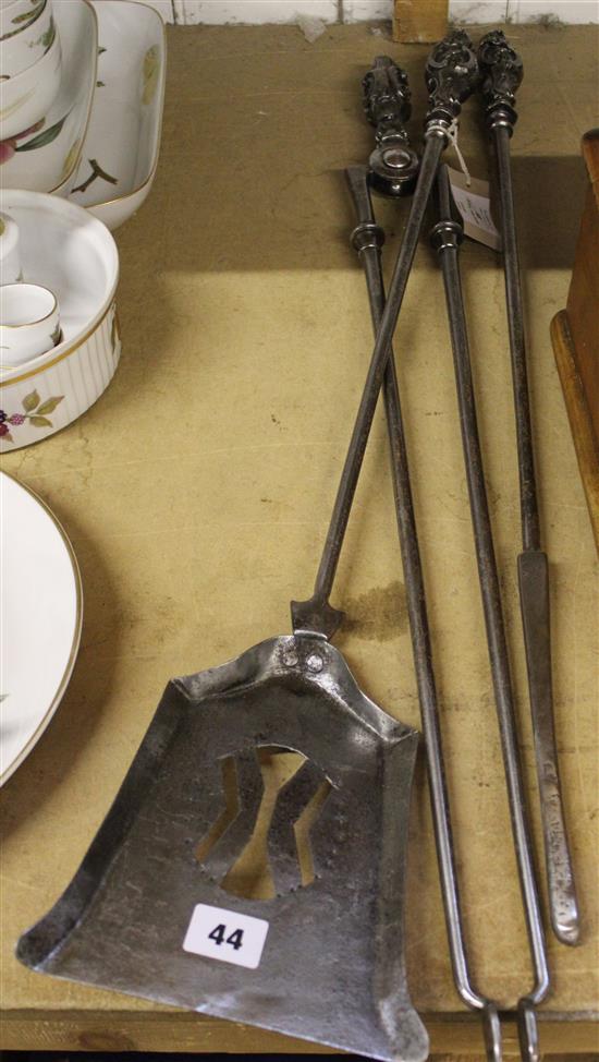 A set of three George III style steel fire irons, with rococo scroll handles, shovel 29.5in