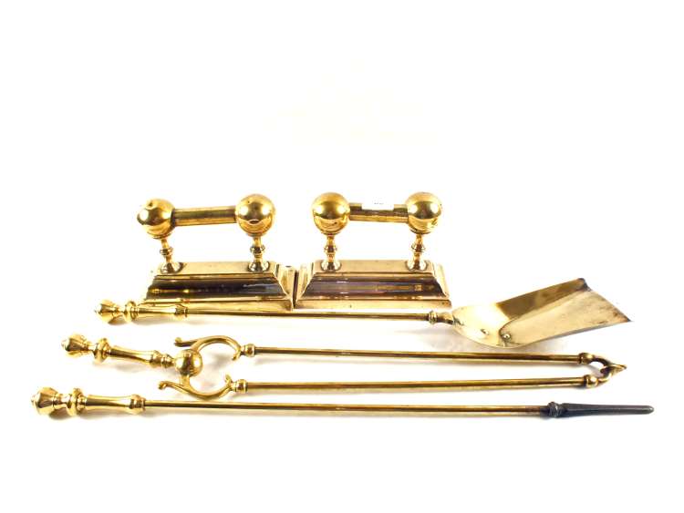 A set of three Victorian Brass fire irons and a pair of Brass fire dogs