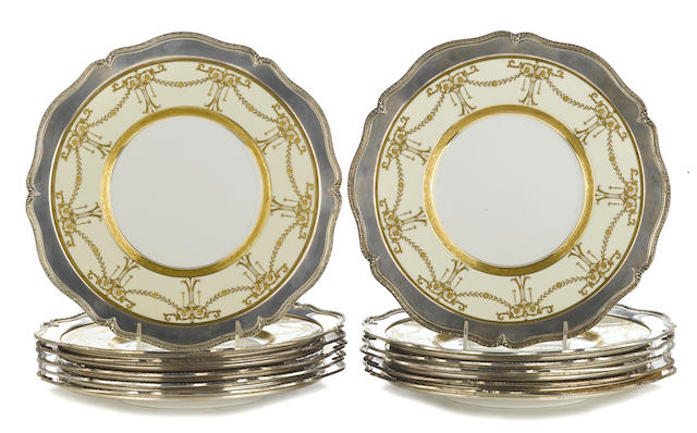 A set of twelve Minton porcelain silver mounted service plates with monogram, ca 1934