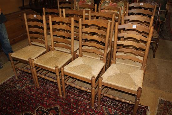 A set of twelve oak ladderback dining chairs, including two carvers, with rush seats