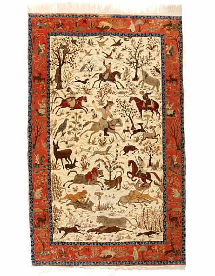A signed semi-antique Qum hunting rug, embellished with horseriding hunters, exotic animlas and birds on light base