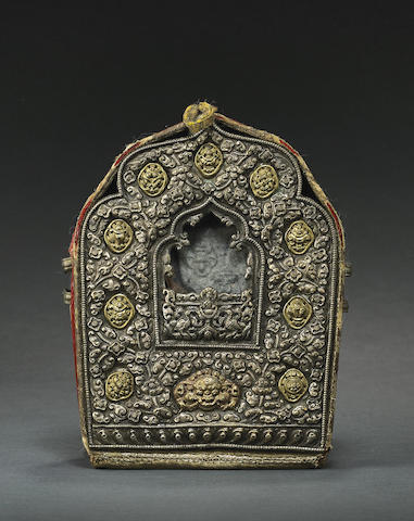 The chased silver front with foliate scrolls and applied gilt plaques of the ashtamangala and a kirtimukha that surround an ogival opening with loose glass fronting a gray clay tsatsa molded with seated divinities around a stupa placed on top of othe