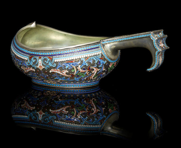 traditional form with flat hook handle, enamelled with with colourful stylized foliage against stippled ground, top and bottom outlined with borders of blue dots