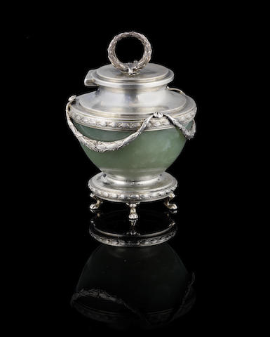 the bowenite body upon circular base with rim of chased laurel leaves above four winged paw feet, the silver shoulder with chased laurel rim suspending acanthus swags, the hinged cover with ribbon-tied wreath finial