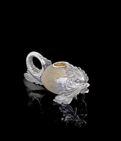 the ovoid sandstone body with silver-gilt well for matches, applied with realistically cast and chased silver mounts in the rococo taste, shaped as dolphin head and looping tail