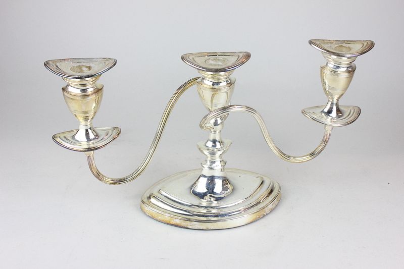 A silver plated candelabra with three sconces and ovoid form