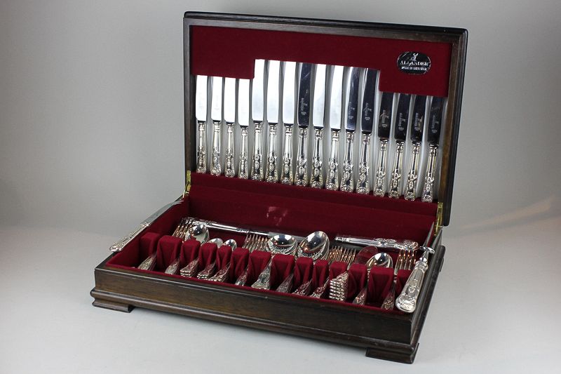 dessert knives, fish knives, table forks, dessert forks, fish forks, dessert spoons and soup spoons, four serving spoons, a carving set and a cheese knife with Allander, Sheffield blades in fitted mahogany case