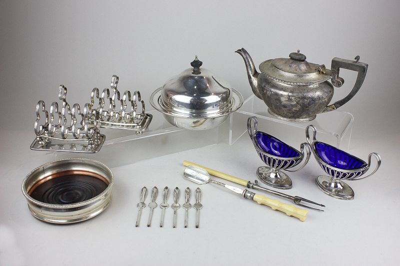 two silver plated boat shaped salts with blue glass liners, a wine coaster, a pair of toast racks (one af) a teapot, six lobster picks, a toasting fork and cheese scoop