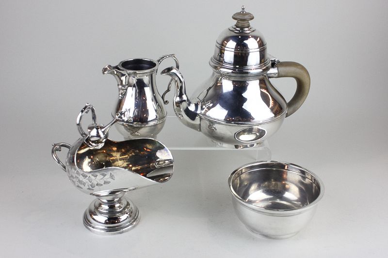 A silver plated three piece tea set with plain bodies, together with a helmet shaped sugar bowl with scoop