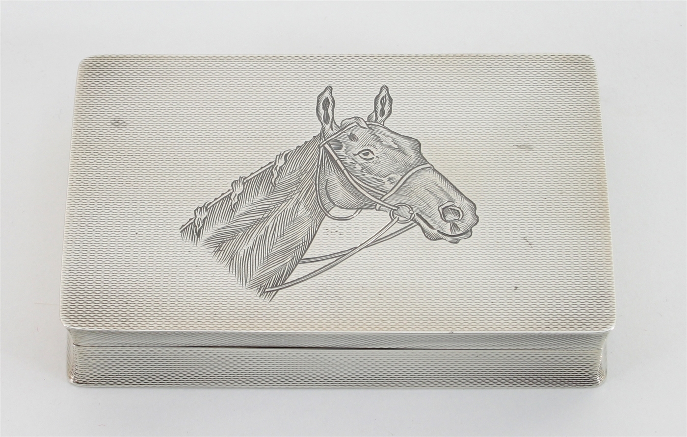 A W, Birmingham 1950, retailed by Asprey, engine turned decoration throughout, the lid centred by a study of a racehorse
