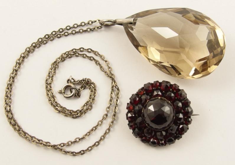 A smoky quartz drop shaped pendant and a garnet set brooch