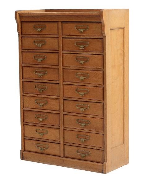 A solid oak 1920-30s chest of drawers, front with 18 drawers, bronze handles