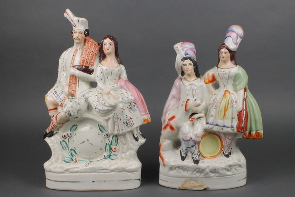 A Staffordshire group of a lady, gentleman and dog 13", a ditto of a Scottish lady and gentleman