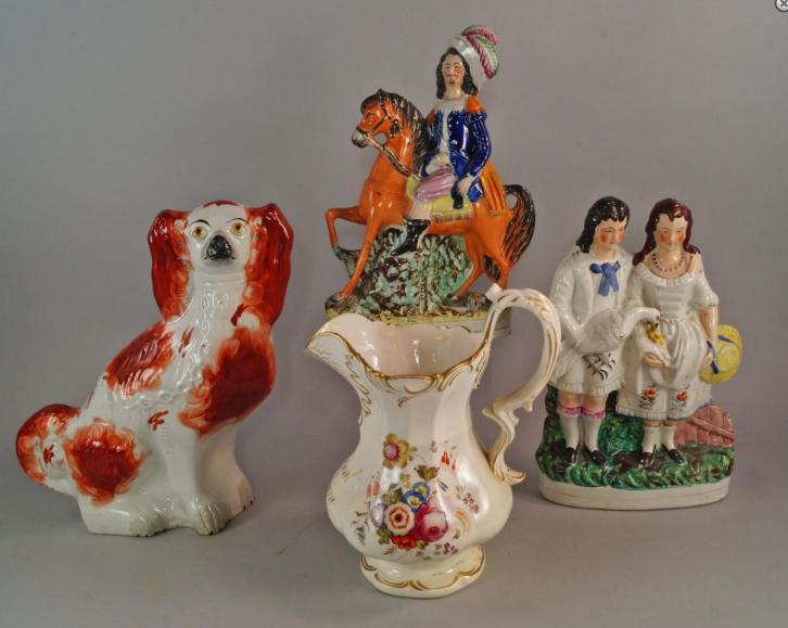 painted with sprays of flowers and gilded to the rims, inscribed a present for Mrs Coburn, 24cm high, together with a pair of Staffordshire dogs, modelled on their haunches, with liver splash decoration, a faience pitcher, a Staffordshire figure grou