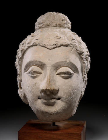 Modeled with rounded features, the serene face with heavy-lidded downcast eyes and bow-shaped lips, his crescent-form rippling curls pulled over the domed ushnisha