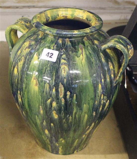 A Studio pottery green, yellow and blue drizzle glazed two handled jar