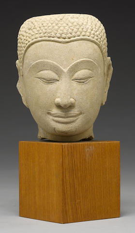Carved with full lips, downcast eyes set off by curved brows, framed by a coiffure of small curls descending in a slight widow's peak (losses)