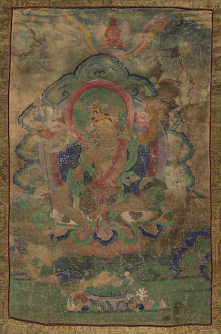 Distemper on cloth; the spirited adept, holding the khatvangha and snare, seated in dynamic pose with Amitabha above.