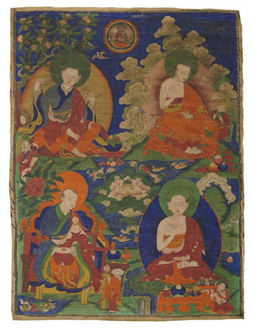 Distemper on cloth; at the top right is Kanakavatsa with a jewel lasso, to the right Bhadra with the right hand raised, at the bottom right possibly Vajriputra, lower left Kanaka Bharadvaja with the hands folded in the lap