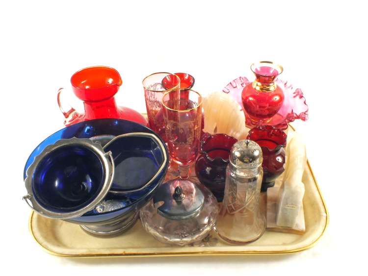 A tray of various glassware and Silver plate