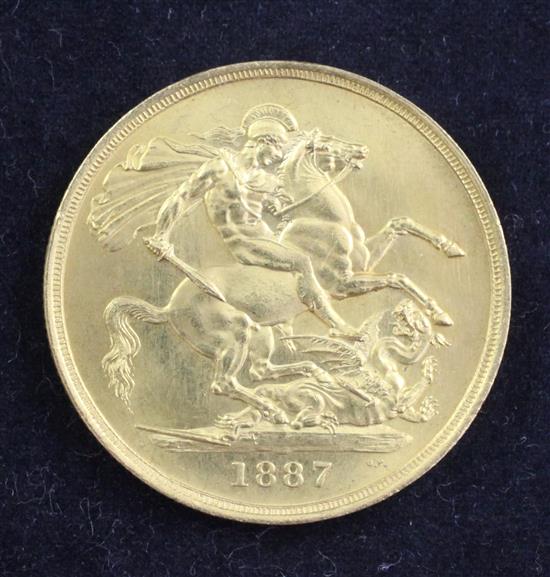 A Victoria Jubilee gold two pounds, 1887, edge wear otherwise EF