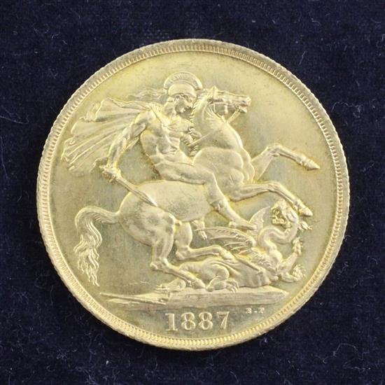A Victoria Jubilee gold two pounds, 1887, slight edge wear otherwise near UNC