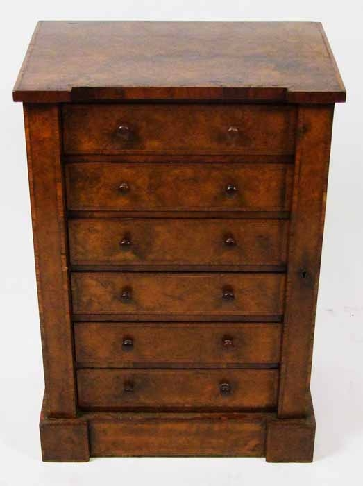 A Victorian burr walnut and crossbanded Wellington chest, of small size, fitted with six drawers, on plinth base