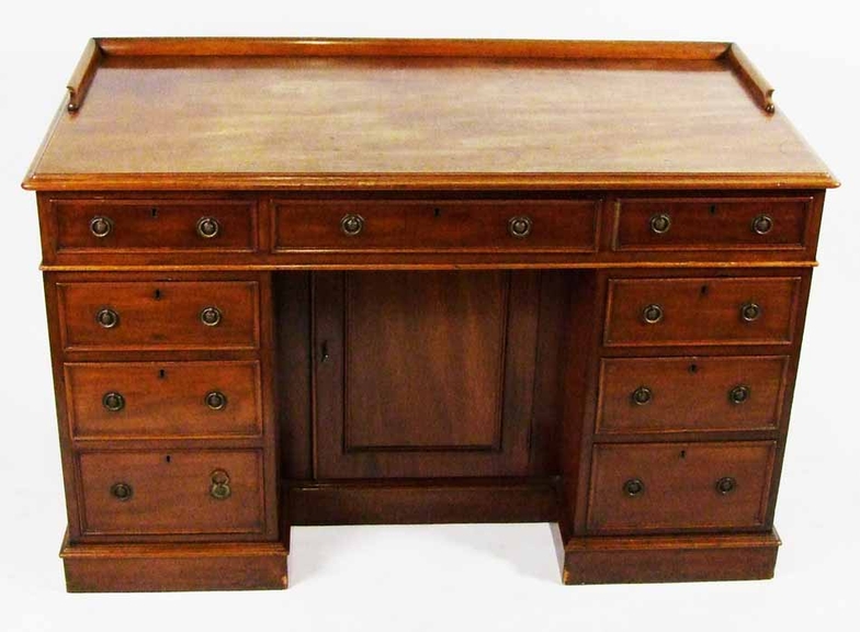 fitted with a central drawer and recessed cupboard, flanked by four graduated drawers, on plinth base