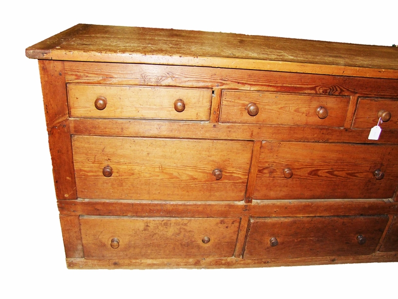 A Victorian panelled pine shop counter, fitted with sixteen drawers, on plinth base