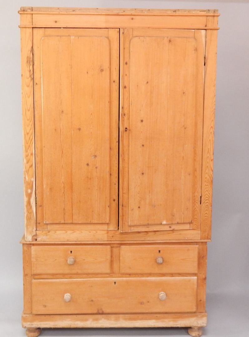 panelled doors opening to reveal hanging hooks, above two short and one long drawer, raised on bun feet