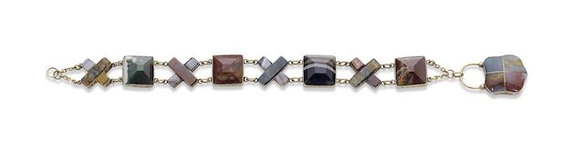 Formed as series of alternating square and cross shaped plaques, each set to one side with vari-coloured agates and to the other side with malachites, with engraved scrolling decoration, mounted in gold, length 21cm, to original fitted case