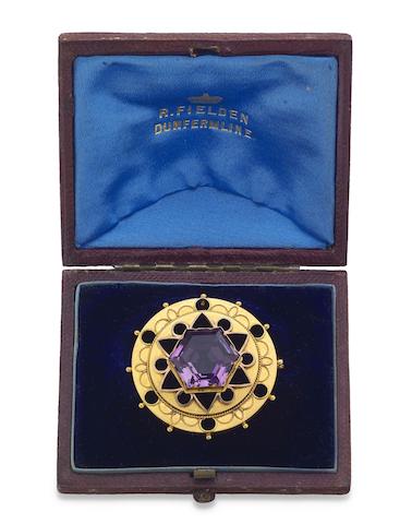Set centrally with a hexagonal-cut amethyst, within a pierced surround of geometric design, with wirework detailing, width 38mm, to original fitted case retailed by Fielden, Dunfermline